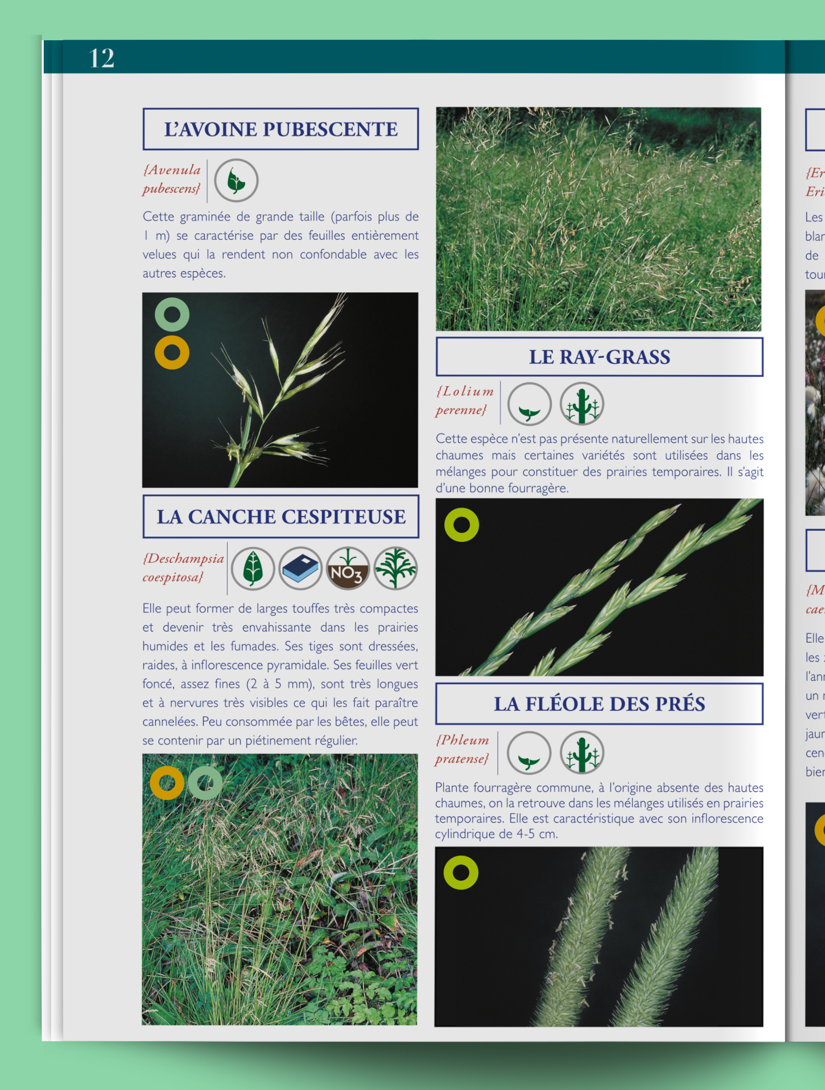 University project where each student was competiting over the first place, to get to finish the selected proposal for the client. Our job was to re-designe and organize a cultural & practical guide for farmers in the Forez, a region in France, about the different kinds of vegetation there is and their properties, to know if they are harmless or benefic for the cattle. I then redesigned the icons to better understand their meaning, and ussed a color scheme to rapidly understand the properties of the plants, as they often use it in the fields. A webdesign was also created to transfer all those informations on the net, allowing farmers and other people to have better understanding of the eco-system they live in.