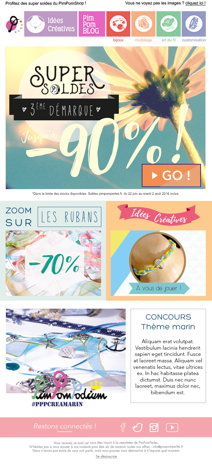 from their clients, their promotions, and the creation of a new template for the newsletter of PimPomPerles.fr, a fantasy jewelry store.